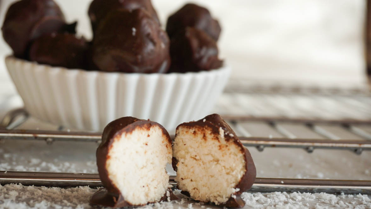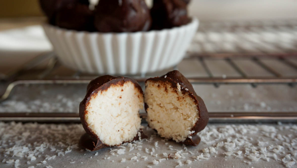 Są delikatne i rozpływają się w ustach. Mocno kokosowe, oblane gorzką czekoladą – słodki mały grzeszek, po którym na pewno nie będziecie mieli wyrzutów sumienia i z chęcią sięgniecie po kolejną kulkę. Pewnie Was nie zdziwi, jeśli napiszę, że znikają w oka mgnieniu, ale formowanie kokosowych obłoków i obtaczanie ich w czekoladzie sprawia tak ogromną radość, że bez zastanowienia mogę szykować kolejną porcję.